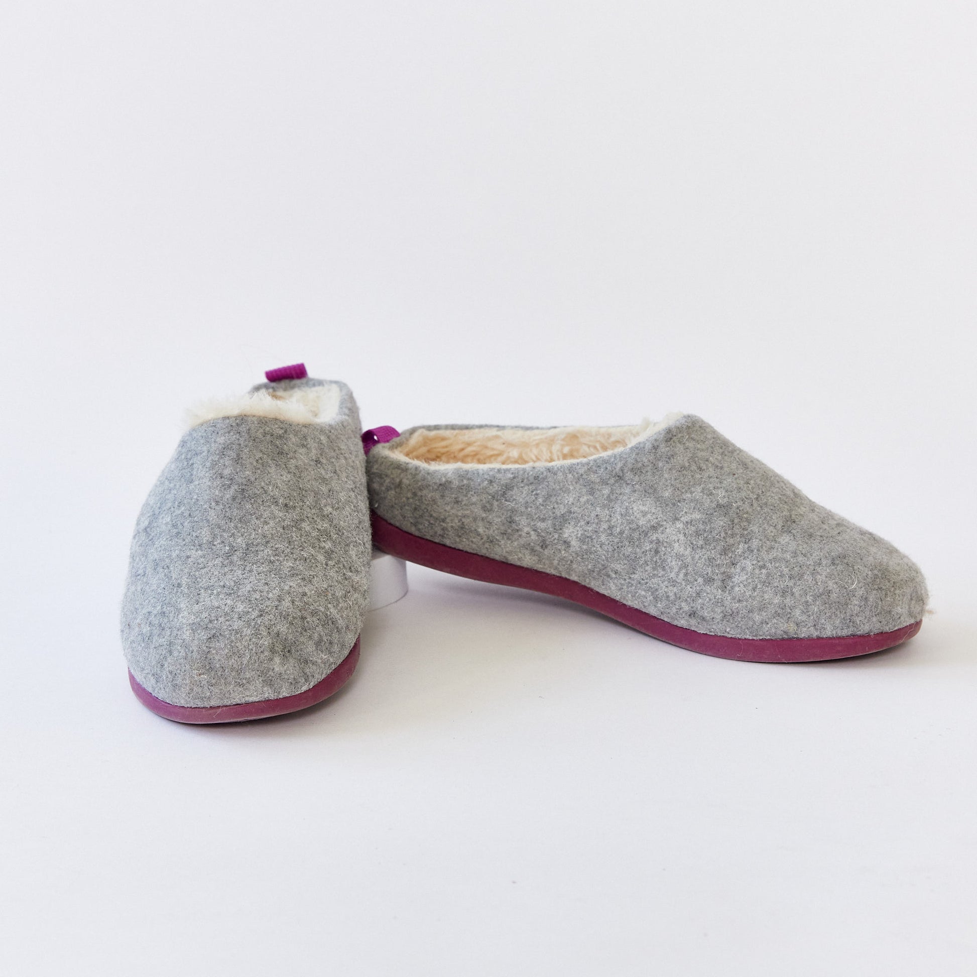 Grey Wool Mule style slipper with purple soles and faux sheepskin lining in size 6