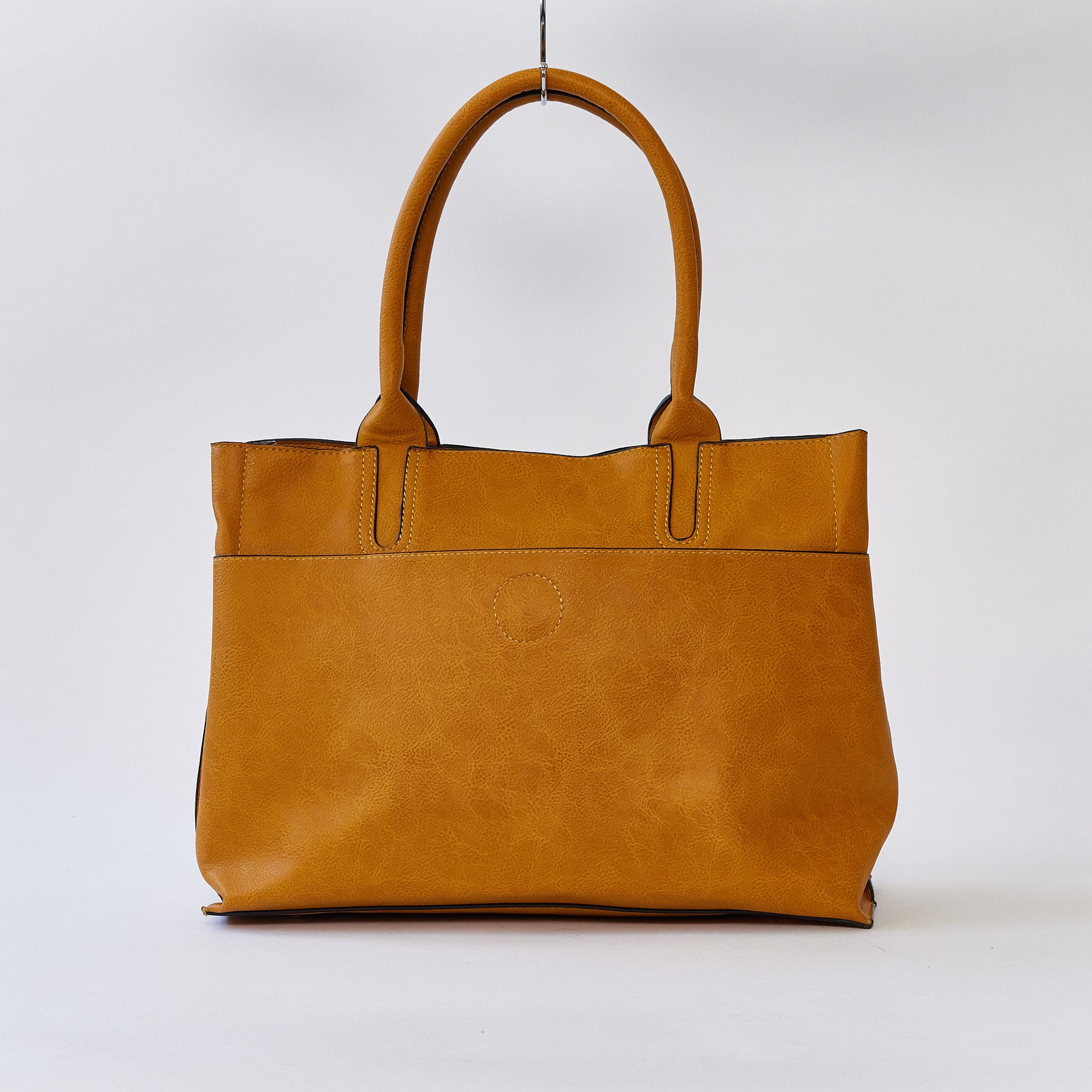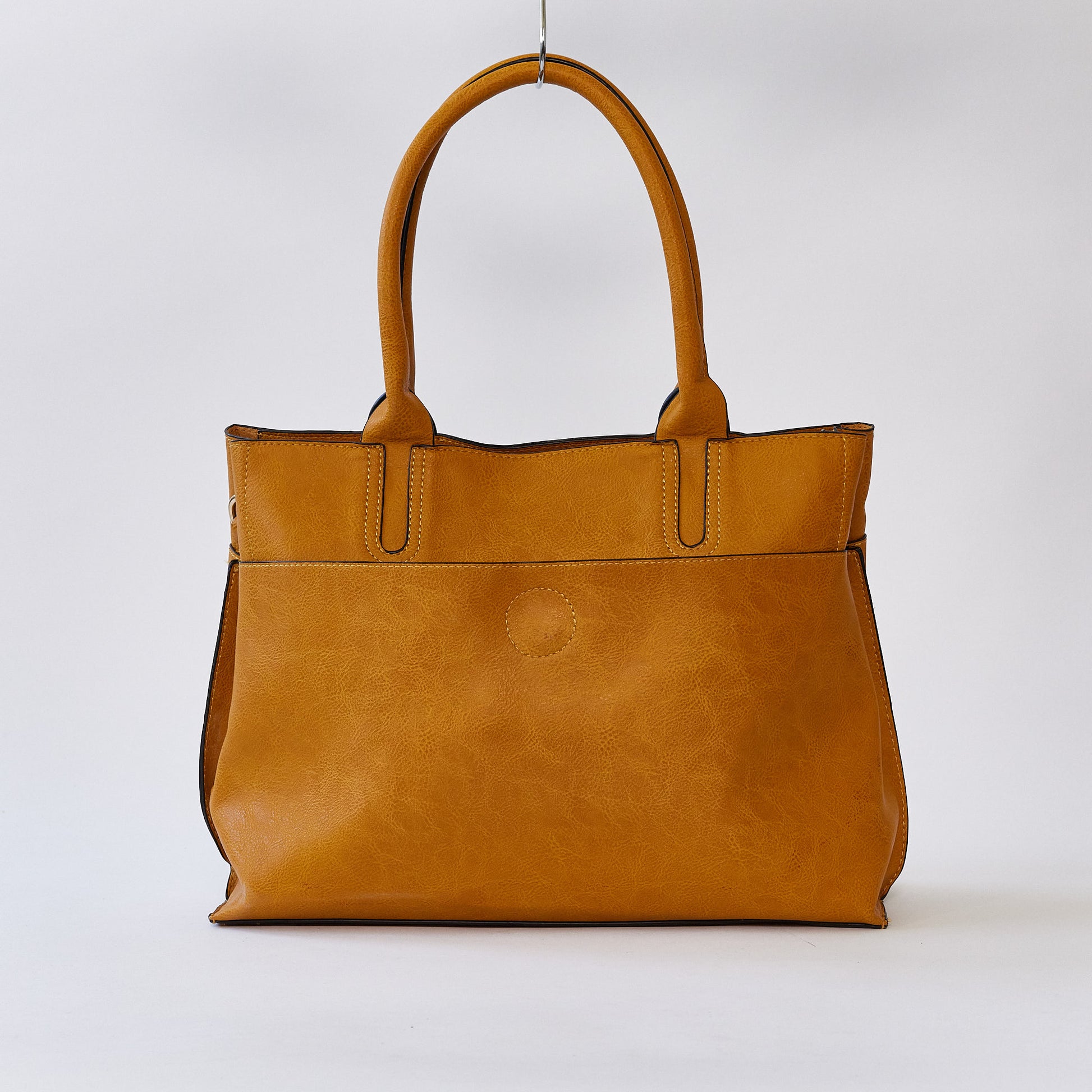Mustard Yellow leatherette tote work bag with zip fastening, can fit a small laptop inside main compartment