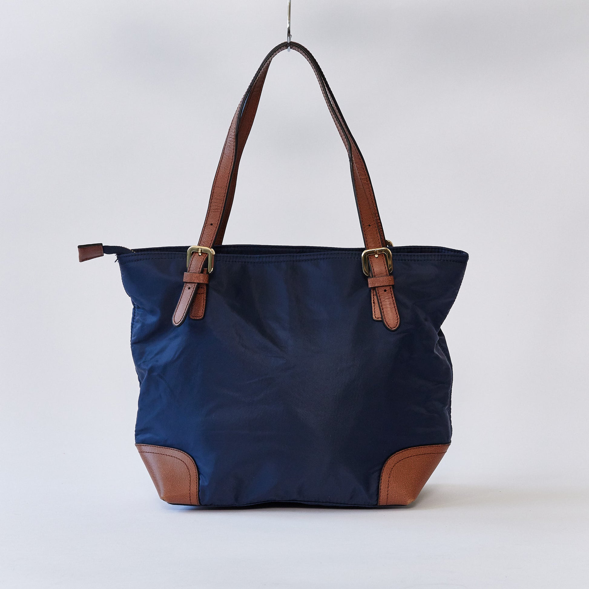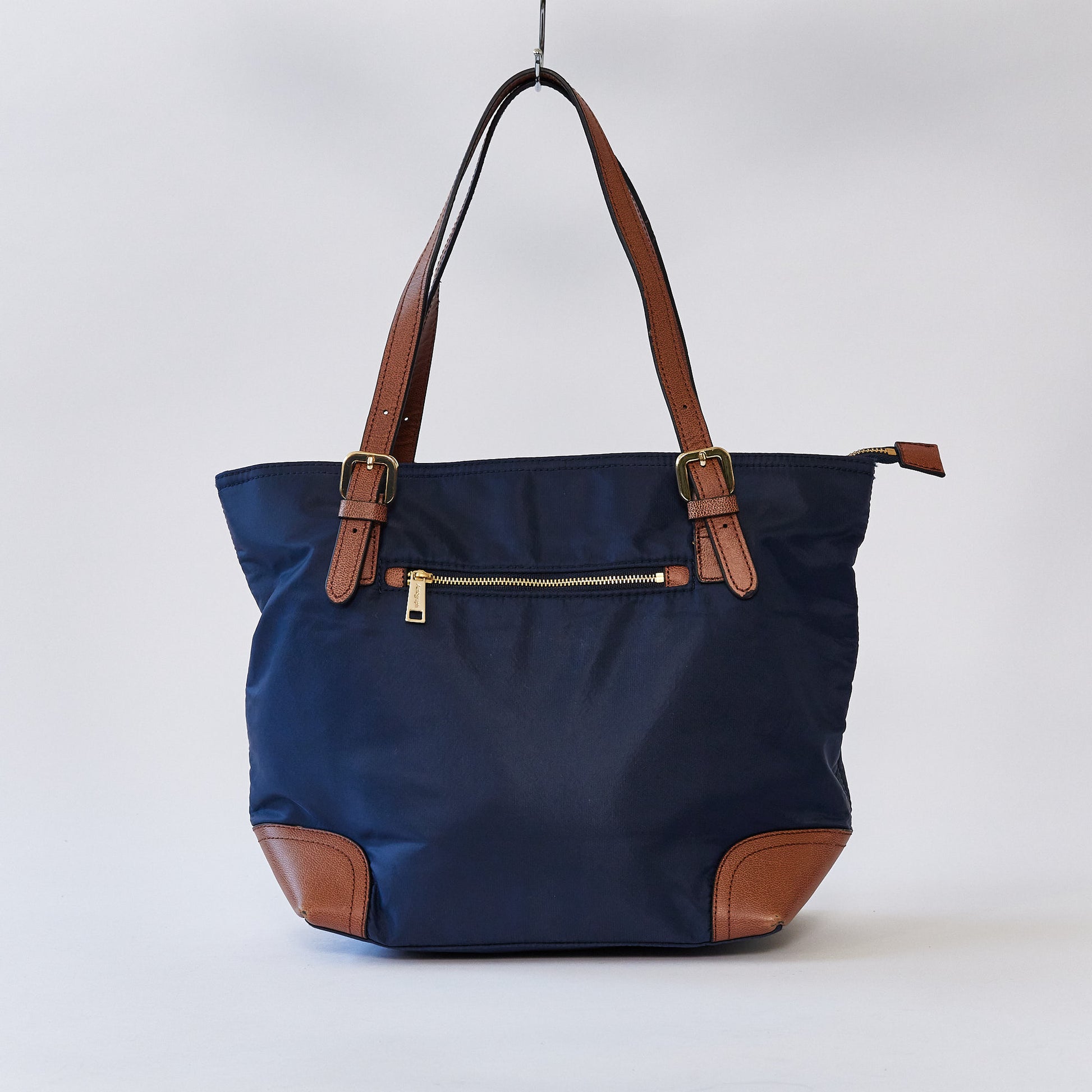 Navy fabric zip up tote bag with brown leatherette buckled straps and front zip pocket