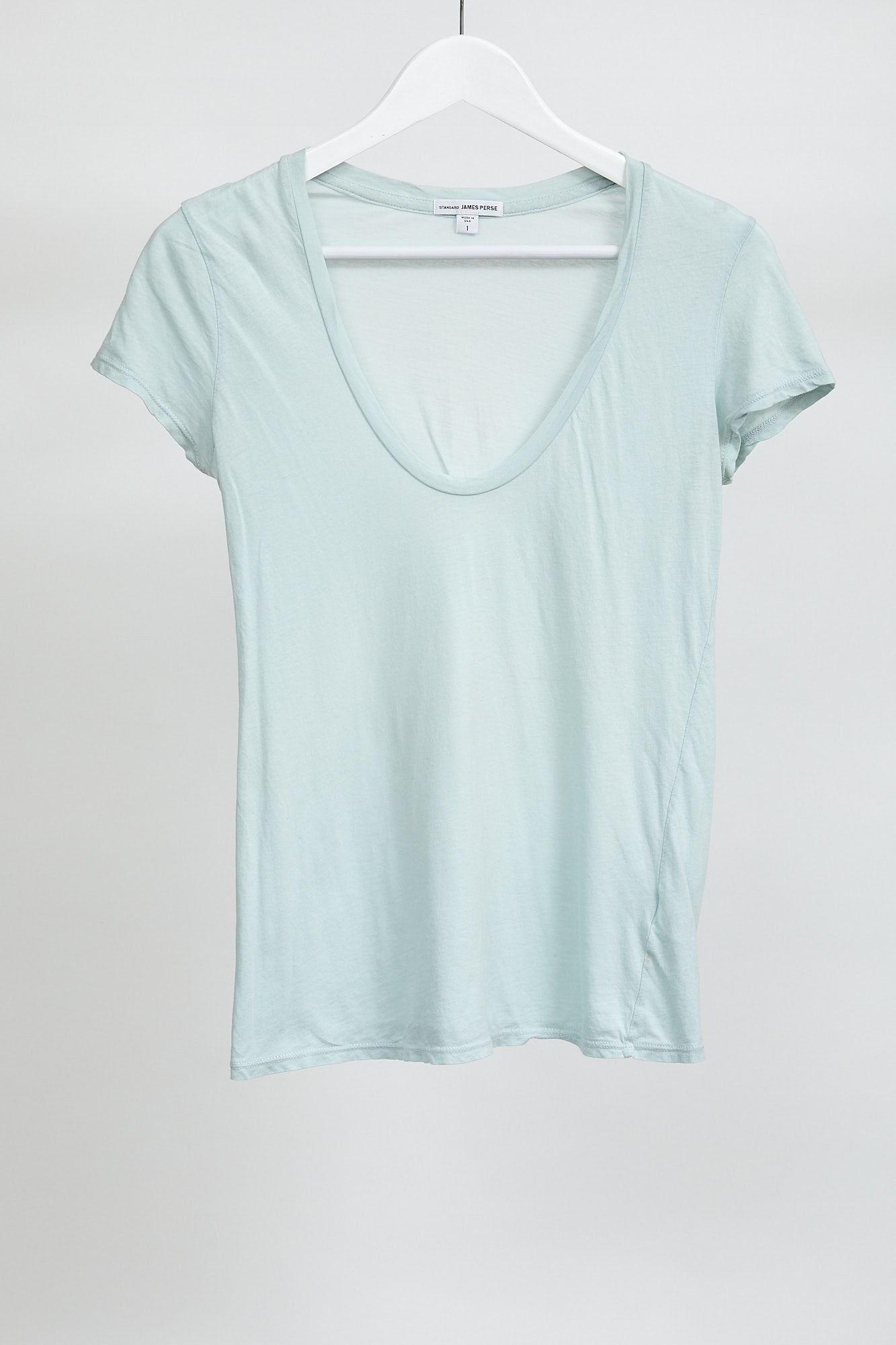 Womens Light Blue Short Sleeve T-Shirt with low neck from James Perse: Size 8-10 or Small