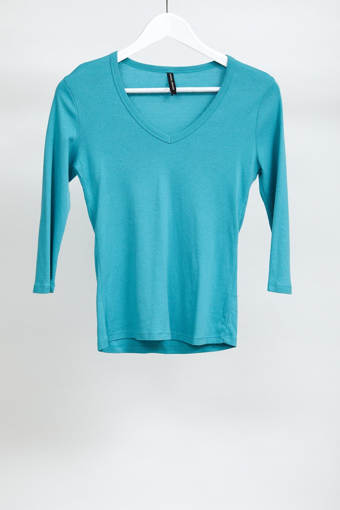 Womens Turquoise Blue V-Neck T-Shirt with 3/4 sleeve: Size 10 or Small