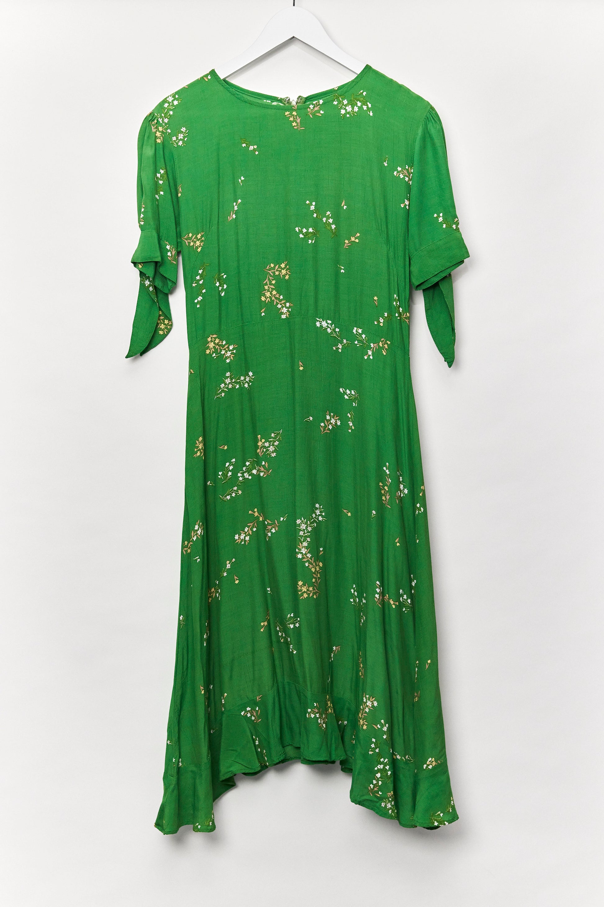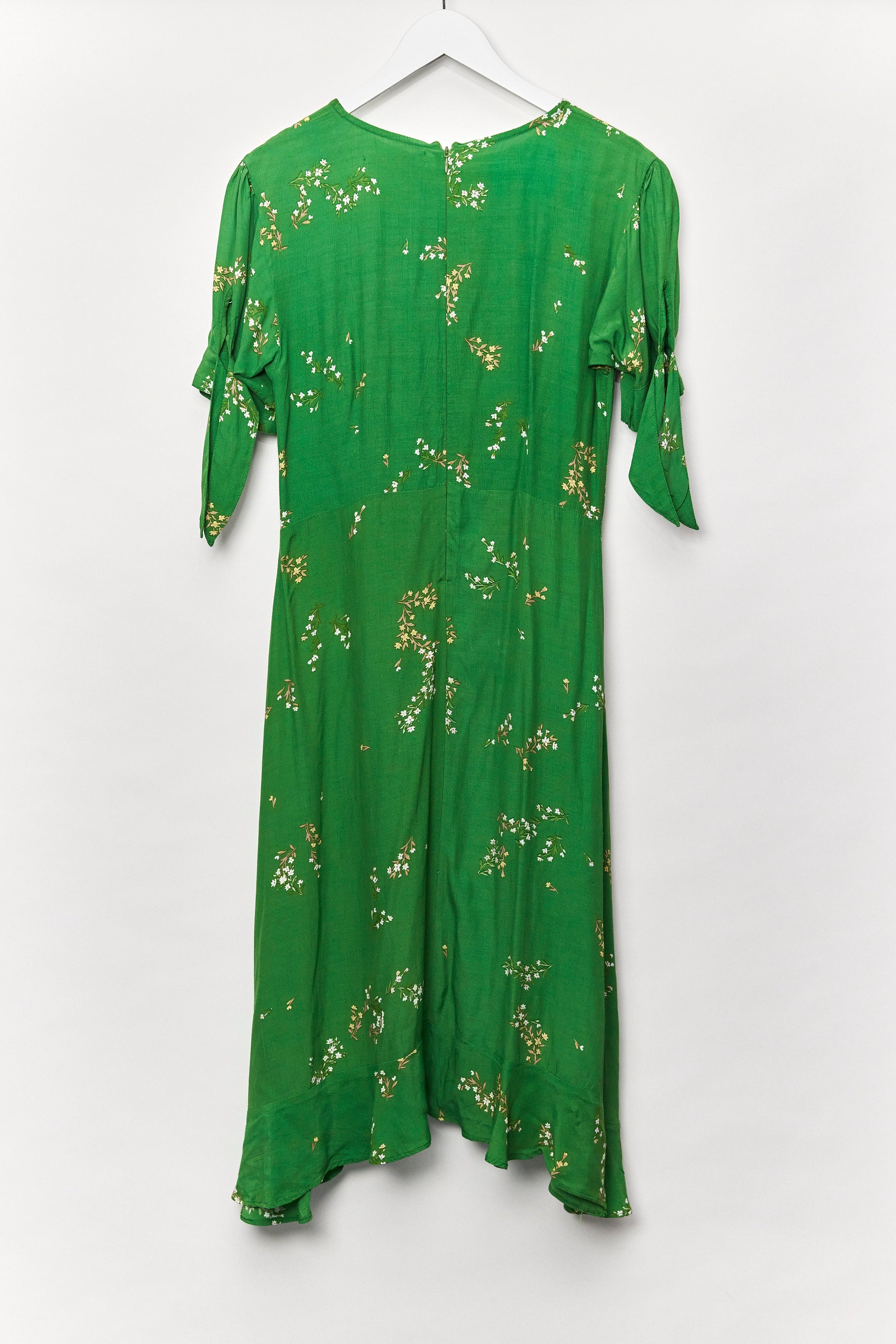 Women's green midi floral print slightly fitted dress with short sleeve and ruffle hem - size small or 10