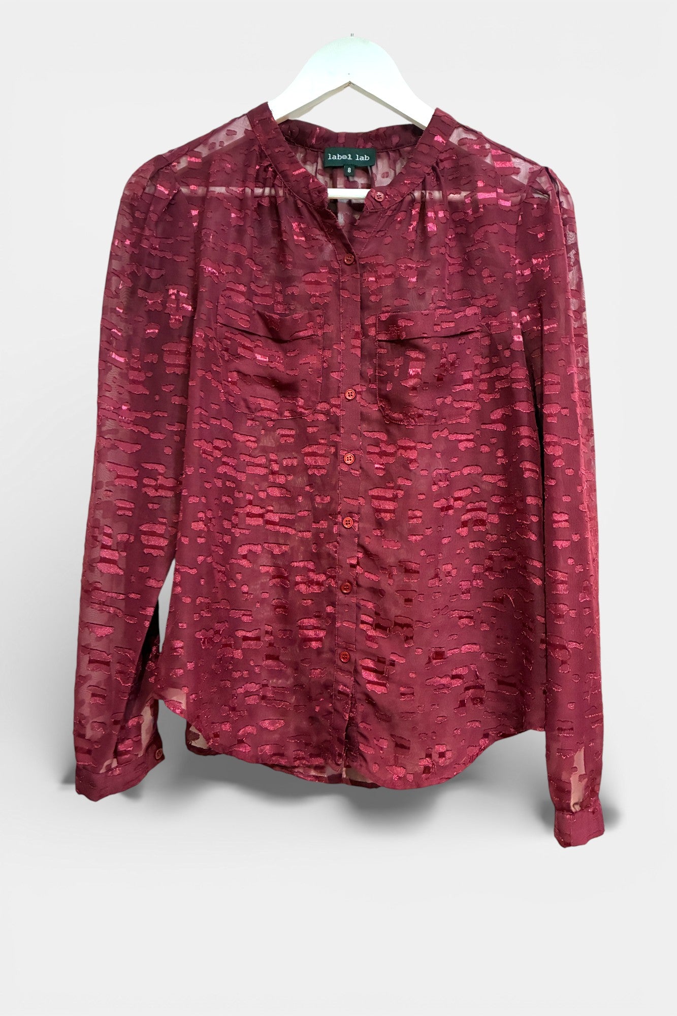 Womens Label Lab Burgundy Red Sheer Pattern Blouse Size 8