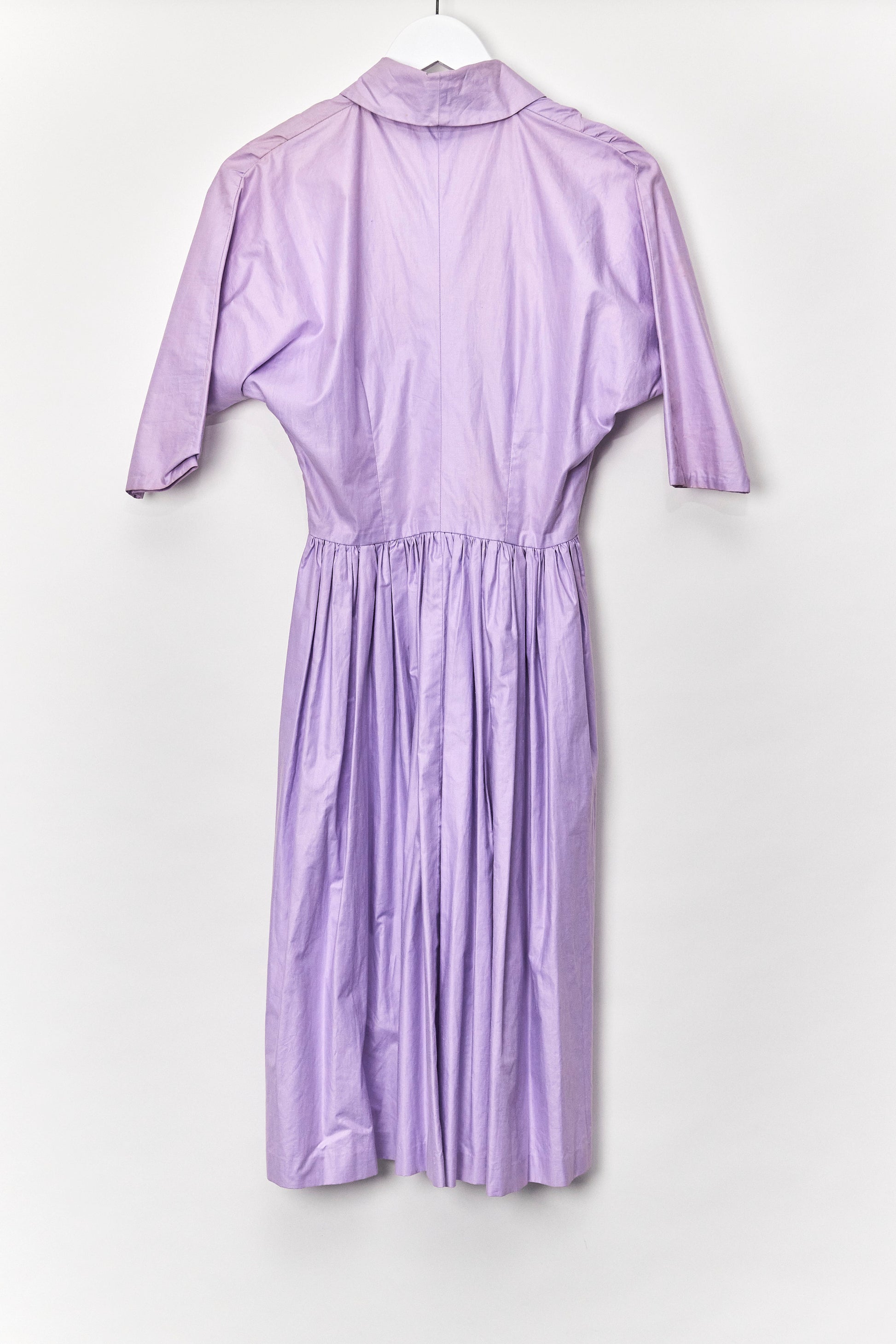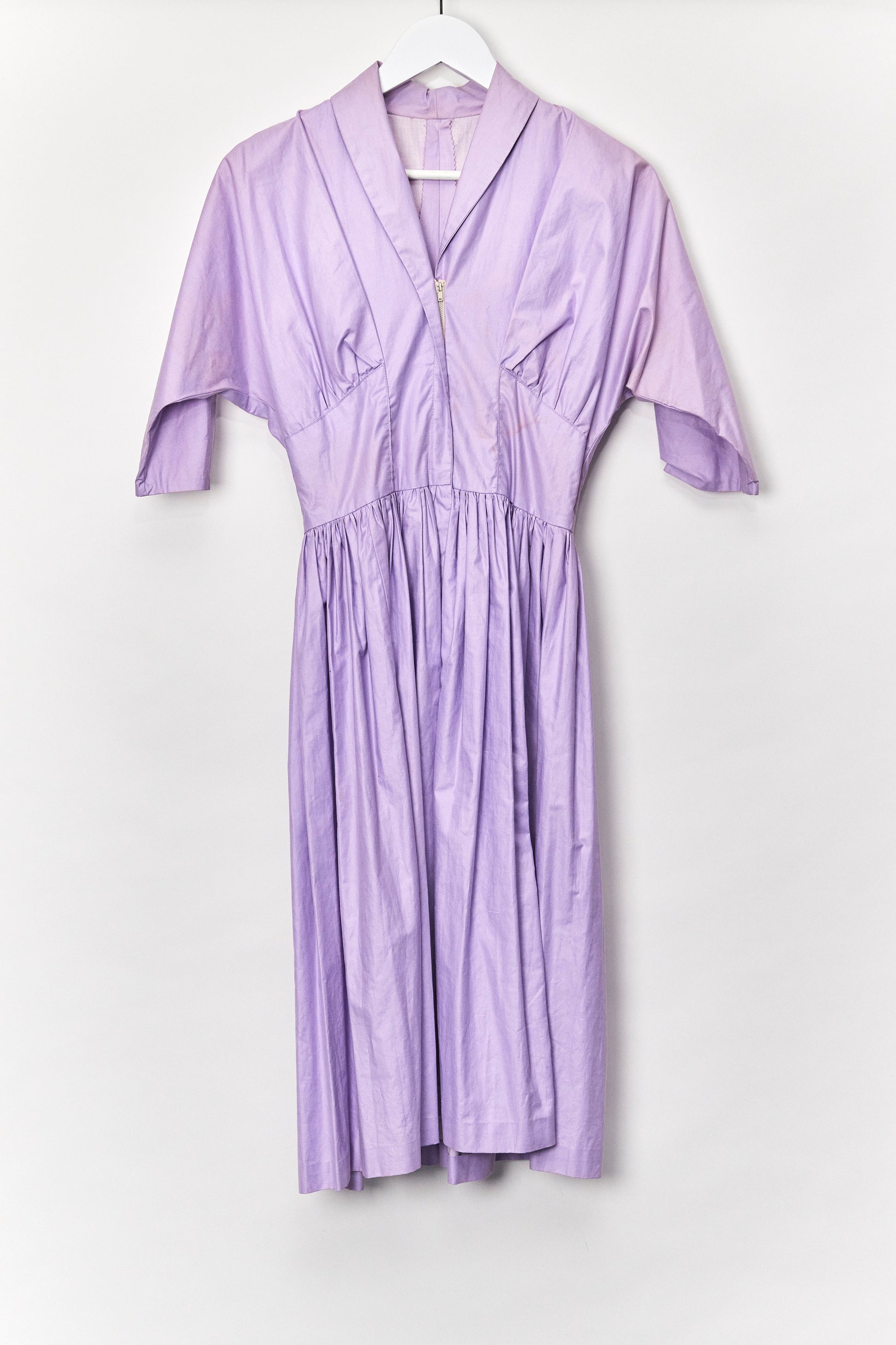 Womens lilac 1950's vintage fitted dress with a full skirt, elbow length batwing sleeve, a v-neck and roll collar size small to fit size 8-10