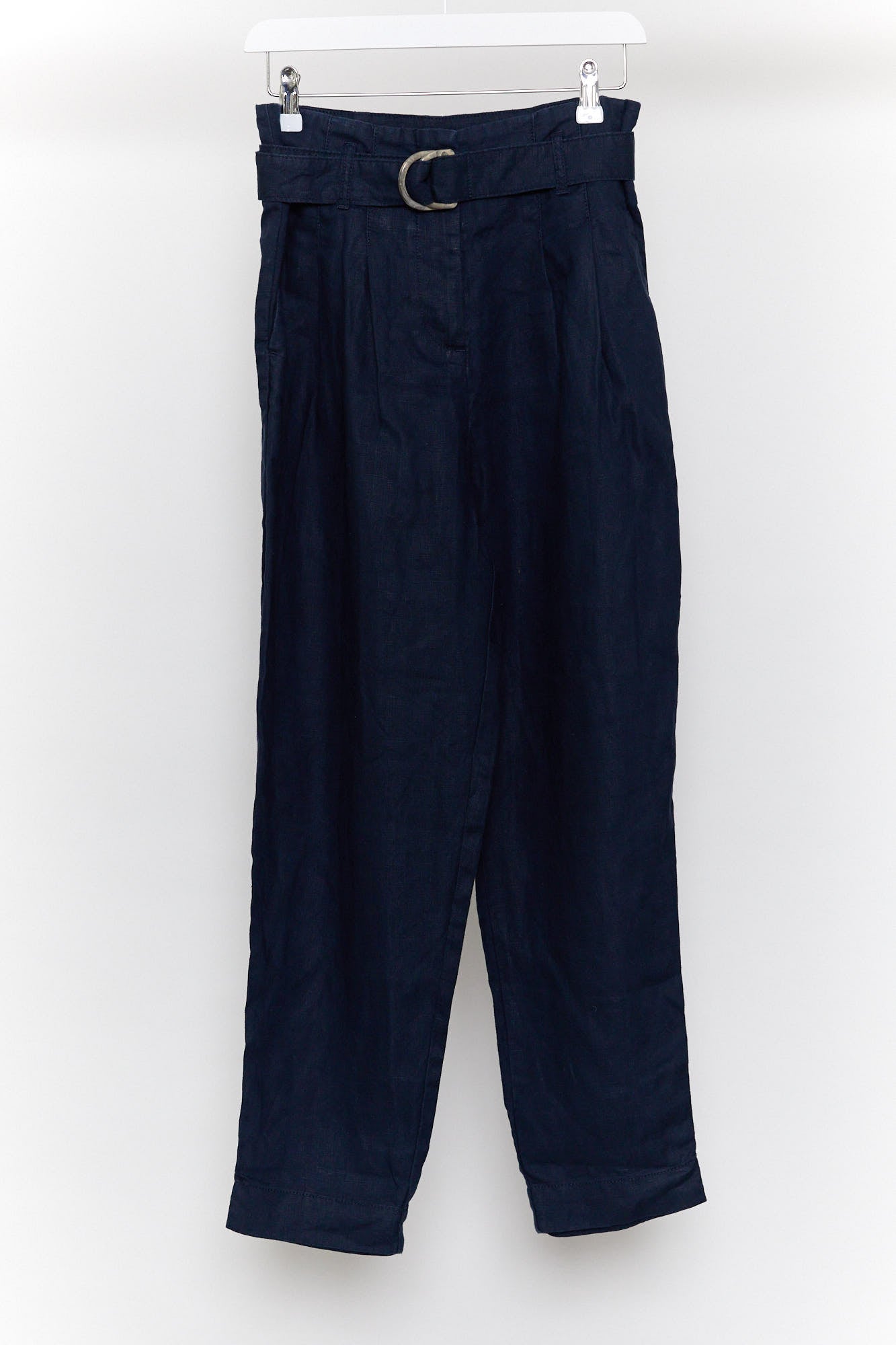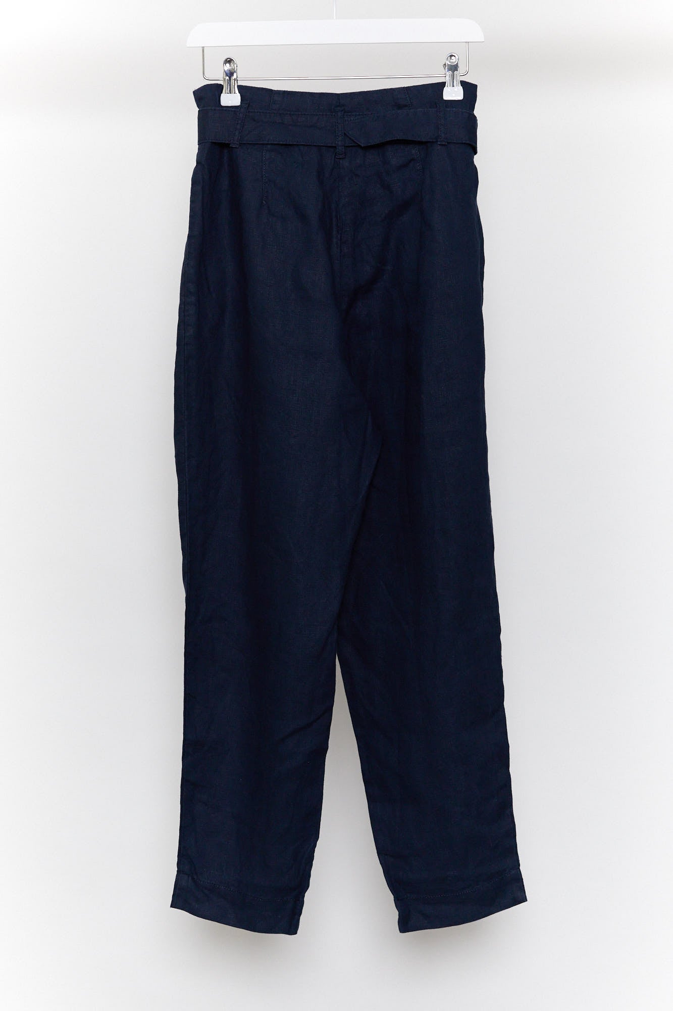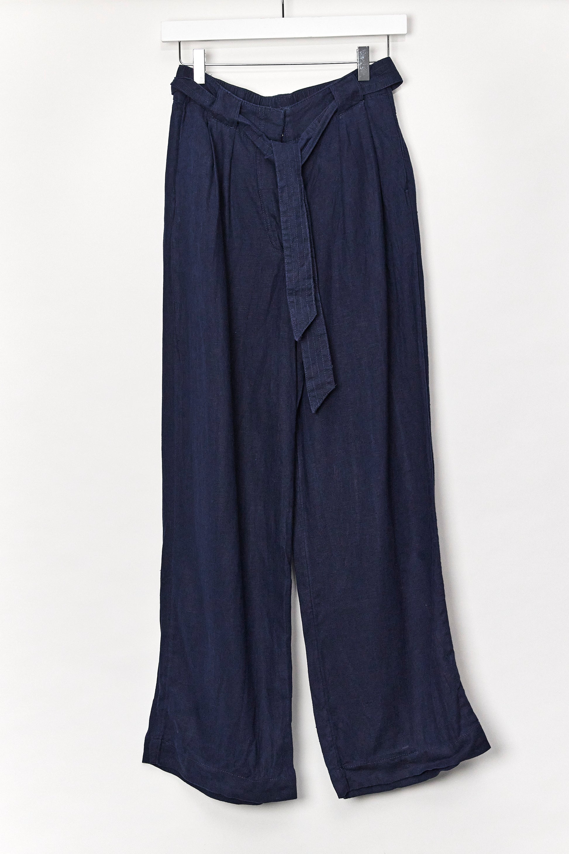 Womens Navy linen belted M&S wide leg Trousers size 10 to fit waist 27.5 leg 28
