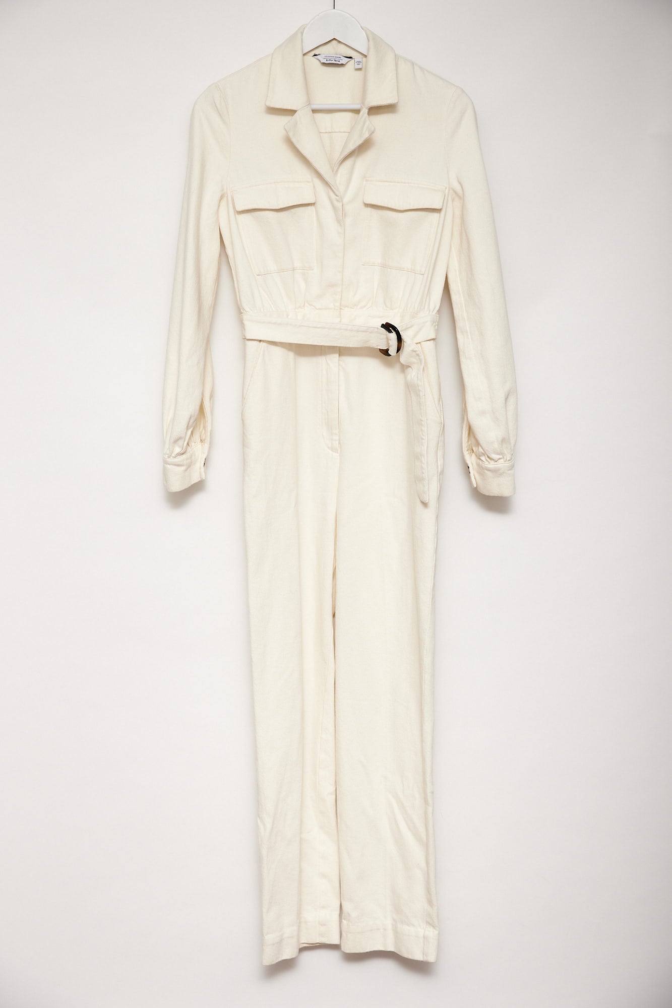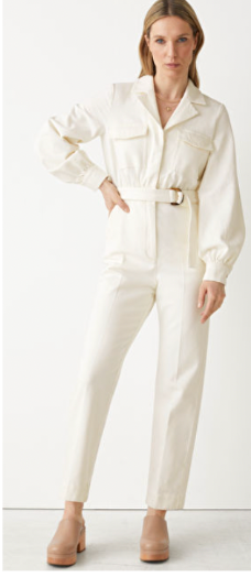 Womens & Other Stories collared, belted white denim jumpsuit with front breast pockets size 8 or small to fit 33" chest 26-27" waist