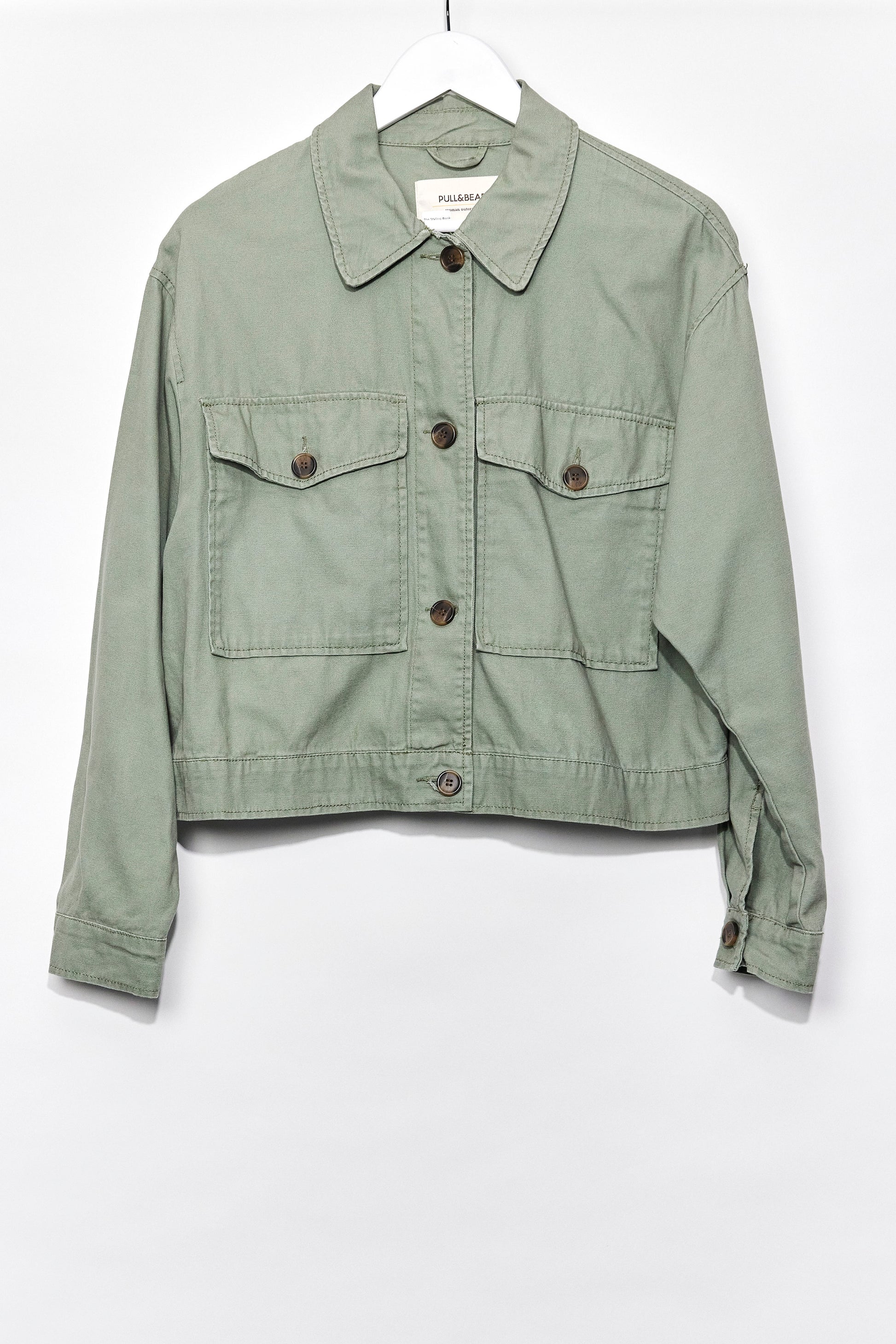 Womens Pull & Bear Khaki Utility Jacket with button front and patch pockets size Medium or 12